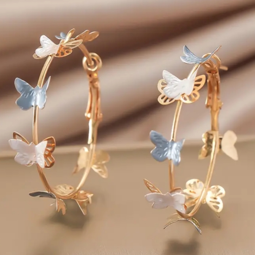 Χρυσοί Κρίκοι Σκουλαρίκια με Γαλάζιες Λευκές Πεταλούδες