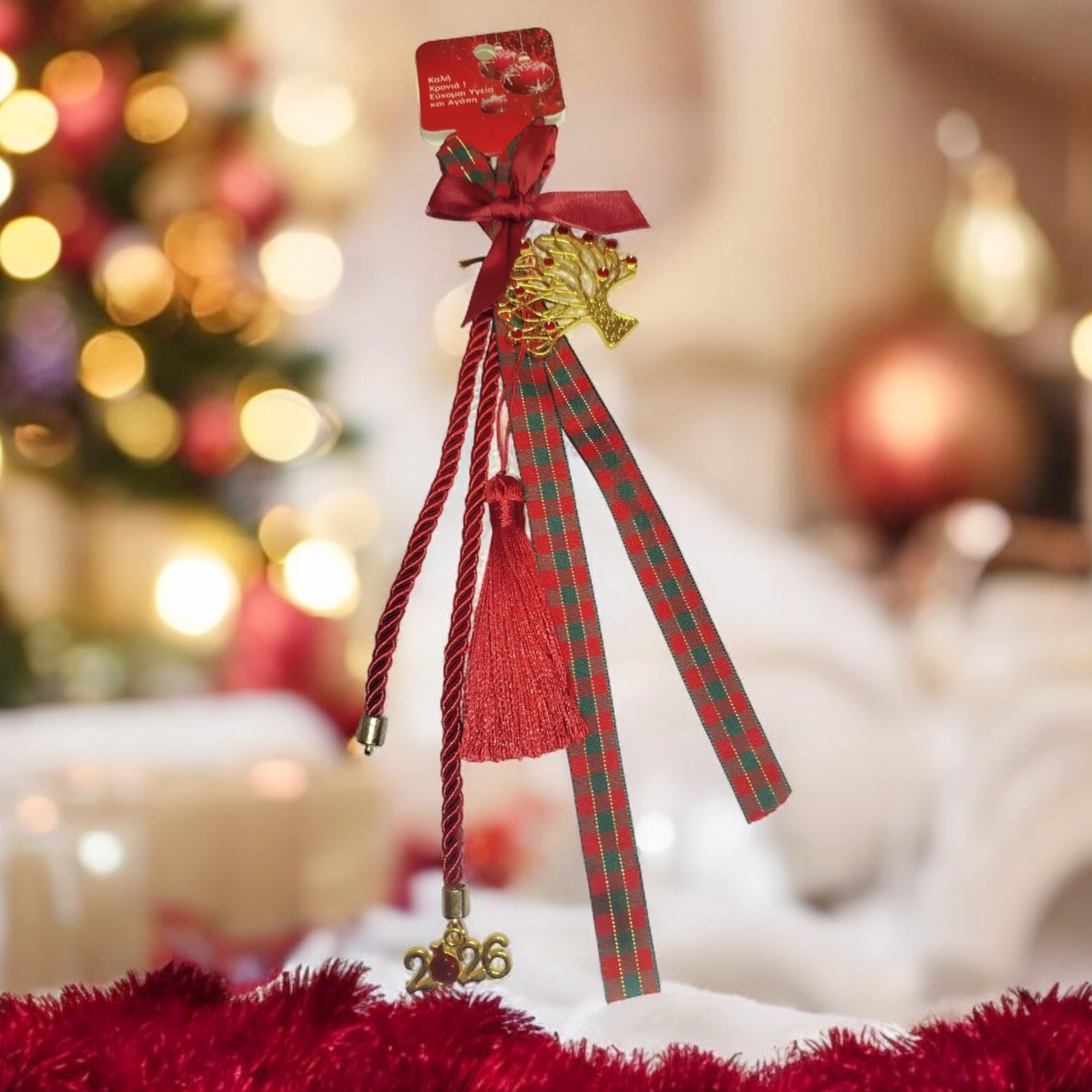 Κόκκινο Πράσινο Γούρι με Κορδέλες Χρυσό Δέντρο της Ζώης και Φούντα 2026