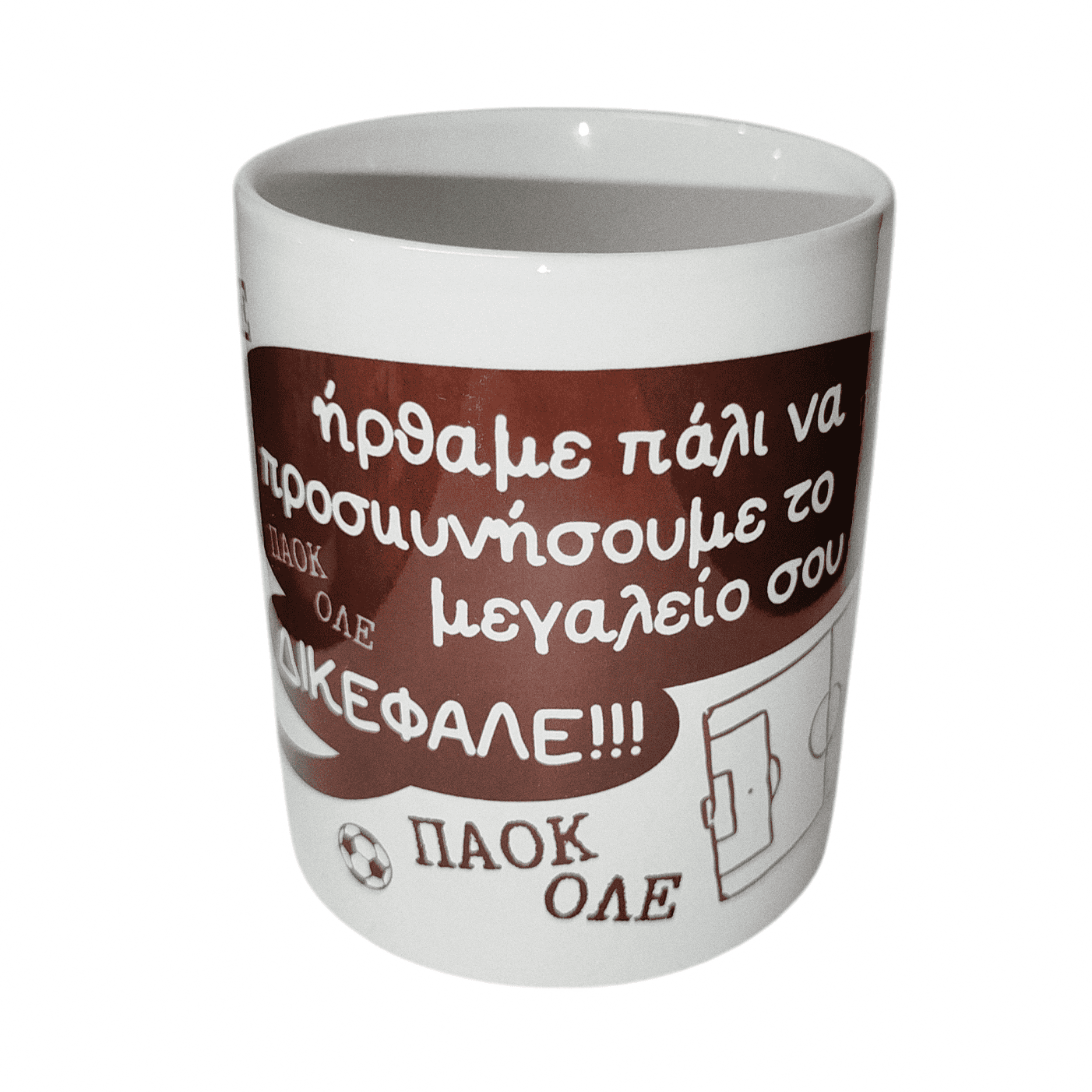 Για τους οπαδούς που δεν σταματούν ποτέ να τραγουδούν για τον Δικέφαλο! Η κούπα ΠΑΟΚ «Ήρθαμε πάλι… Δικέφαλε» είναι εμπνευσμένη από ένα από τα πιο γνωστά συνθήματα της ασπρόμαυρης κερκίδας και μεταφέρει το πάθος της Τούμπας σε κάθε στιγμή της ημέρας.