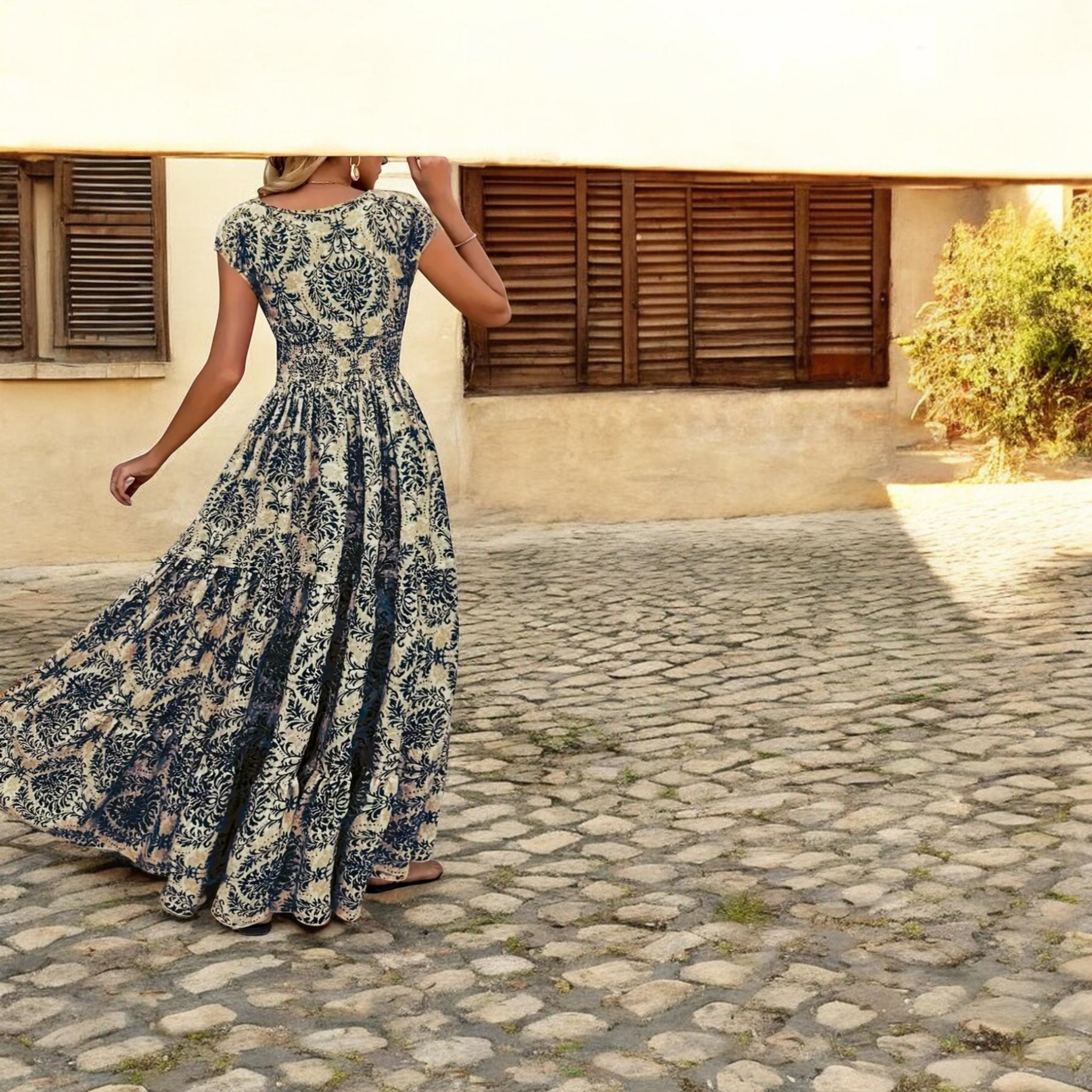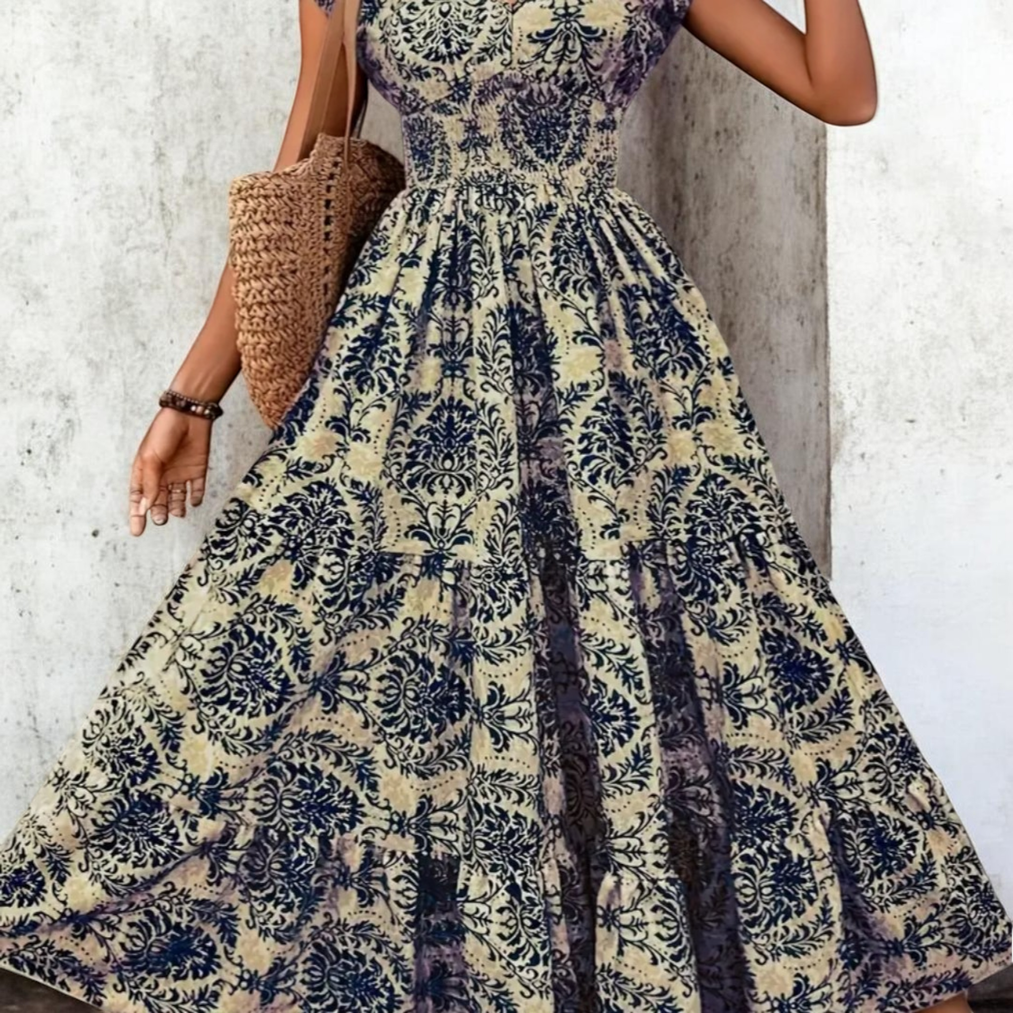 Αναδείξτε τη θηλυκότητα και το στυλ σας με αυτό το εντυπωσιακό μάξι φόρεμα με σχέδια και βολάν στο στρίφωμα. Ο αέρινος σχεδιασμός του και η κομψή γραμμή το καθιστούν ιδανικό για κάθε περίσταση, από καθημερινές εμφανίσεις μέχρι πιο ιδιαίτερες εξόδους.