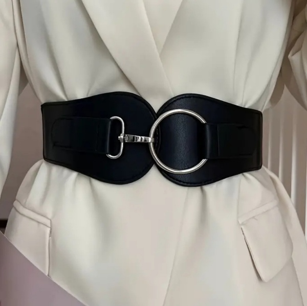 Μαύρη Φαρδιά Ζώνη – Κορσέ Δερματίνη και Λάστιχο με Ασημένια Στρογγυλή Αγκράφα