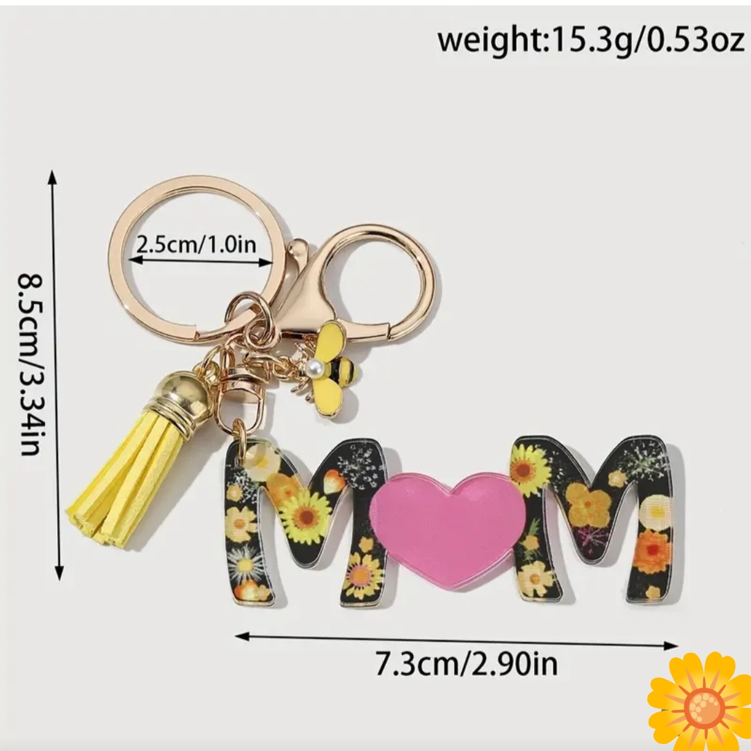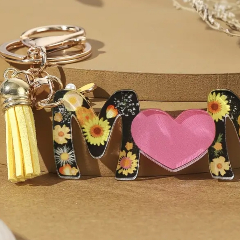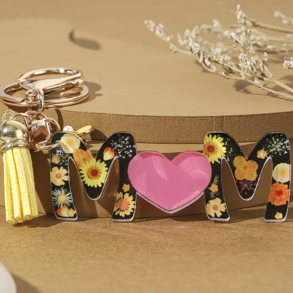 Κομψό μπρελόκ με το σχέδιο “MOM”, διακοσμημένο με όμορφα λουλούδια και μια γλυκιά καρδιά που συμβολίζει την αγάπη για τη μαμά. Ένα ξεχωριστό αξεσουάρ που συνδυάζει πρακτικότητα και συναίσθημα, ιδανικό για να στολίζει κλειδιά ή τσάντες.