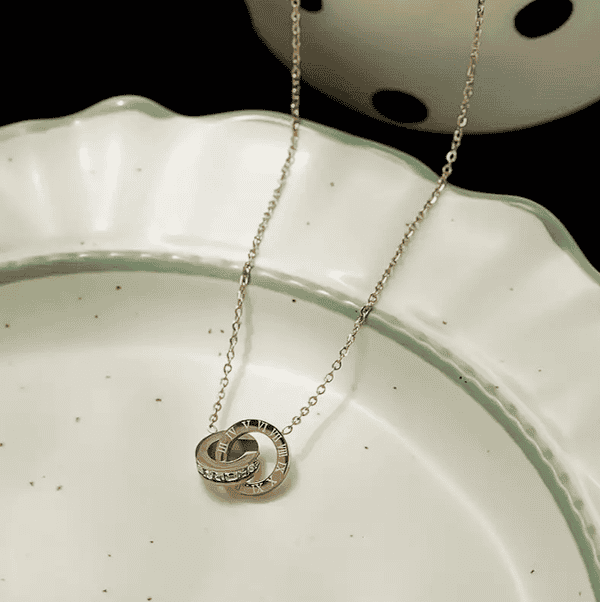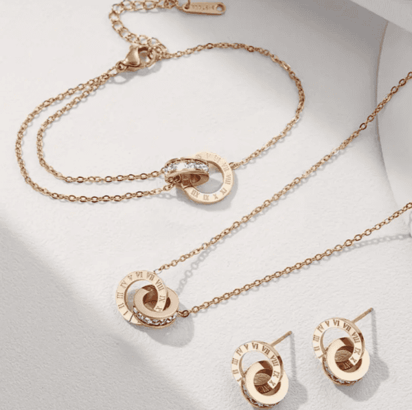 Εντυπωσιακό σετ κοσμημάτων – κολιέ, βραχιόλι, σκουλαρίκια – σε ροζ χρυσή απόχρωση με λατινικούς αριθμούς και στρας
