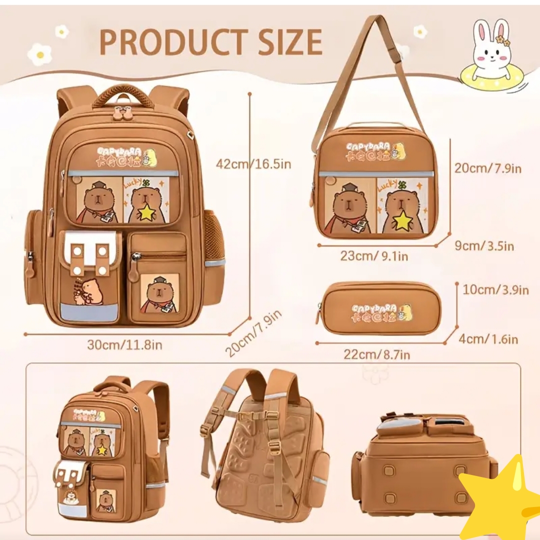 Σετ 3 Τεμαχίων Σχολική Τσάντα Πλάτης, Κασετίνα και Τσαντάκι Φαγητού Καφέ με Σχέδιο Capybara
