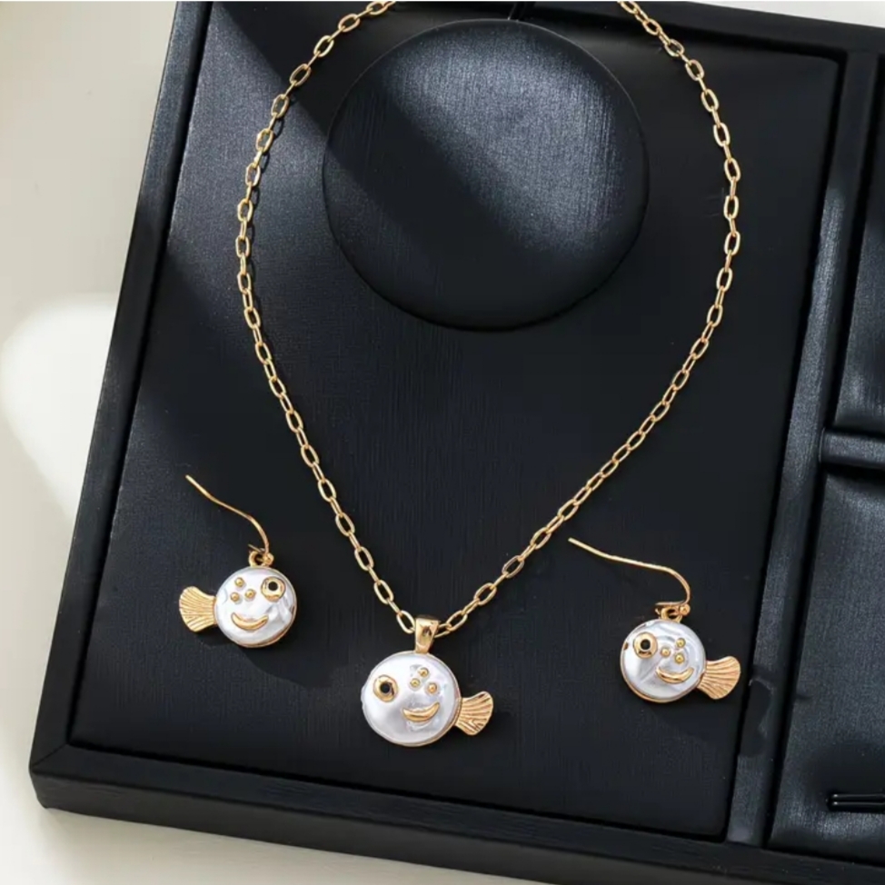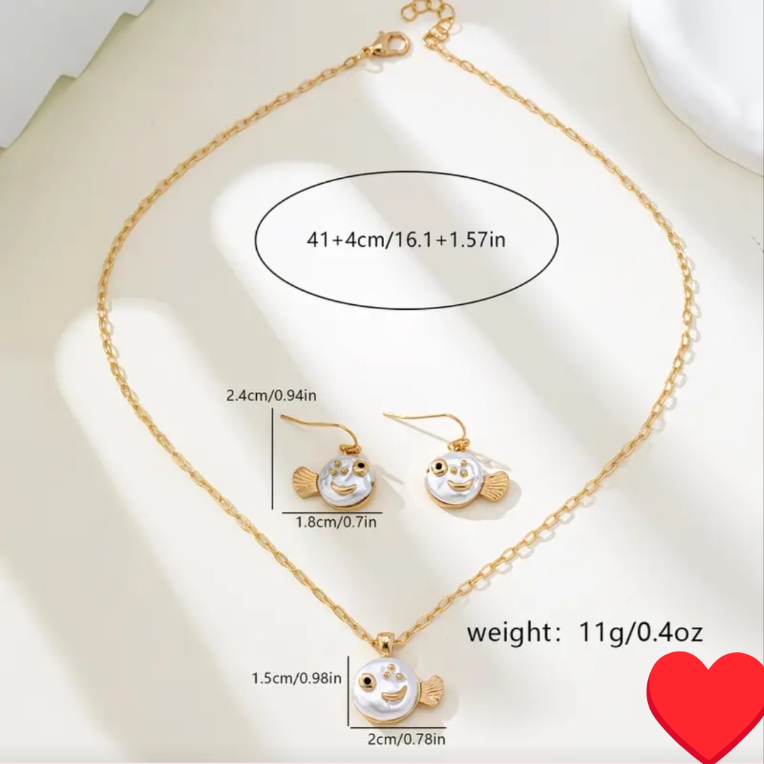 -17%Αναδείξτε το στυλ σας με αυτό το κομψό σετ κοσμημάτων που περιλαμβάνει κολιέ και σκουλαρίκια σε μοναδικό σχέδιο ψαράκι. Το χρυσό χρώμα προσθέτει μία διακριτική λάμψη, καθιστώντας το ιδανικό για καθημερινές αλλά και πιο ιδιαίτερες εμφανίσεις.