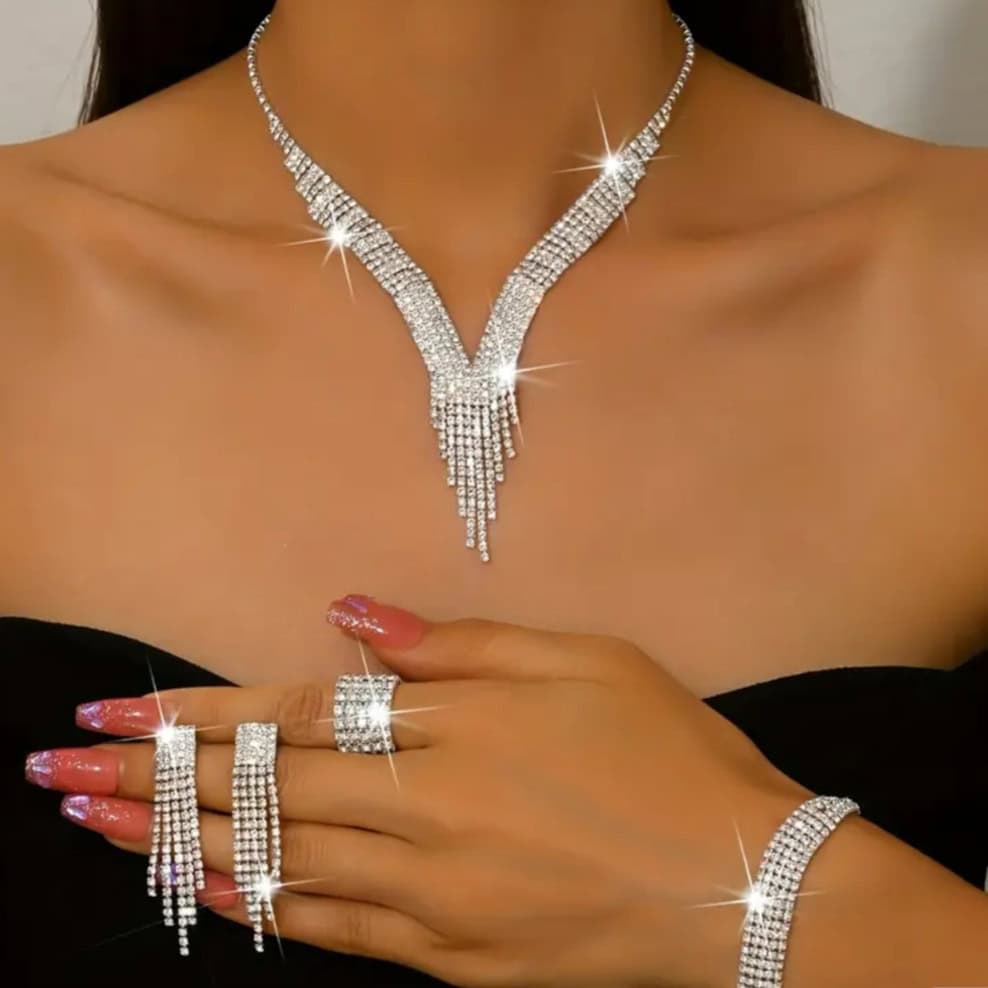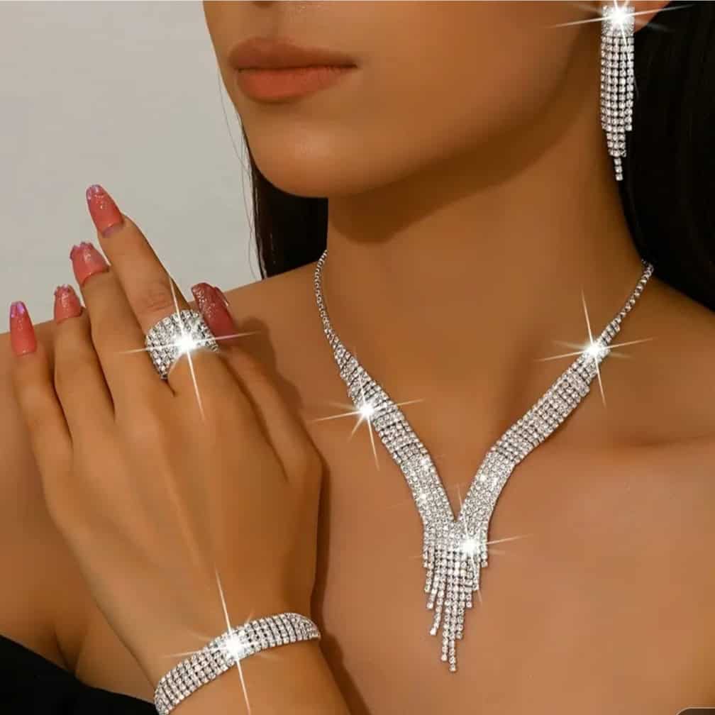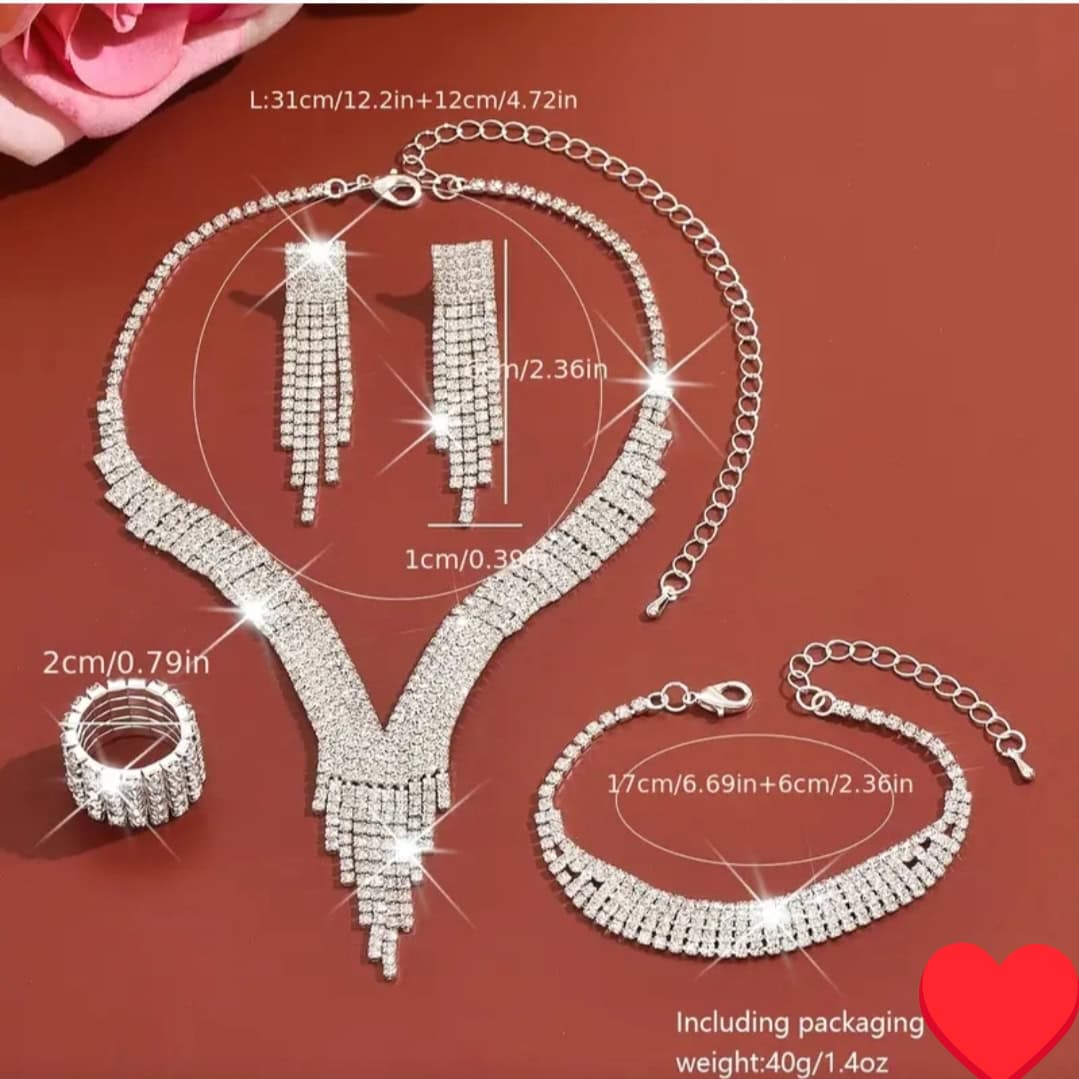 Λαμπερό σετ κοσμημάτων που περιλαμβάνει κολιέ, σκουλαρίκια και δαχτυλίδι, διακοσμημένα με εντυπωσιακά στρας για έξτρα λάμψη. Ο κομψός και θηλυκός σχεδιασμός του αναδεικνύει κάθε εμφάνιση, από βραδινές εξόδους έως ιδιαίτερες περιστάσεις. Φοριέται ως ολοκληρωμένο σετ για ενιαίο στυλ ή και μεμονωμένα για διακριτική λάμψη. Ιδανική επιλογή για δώρο.