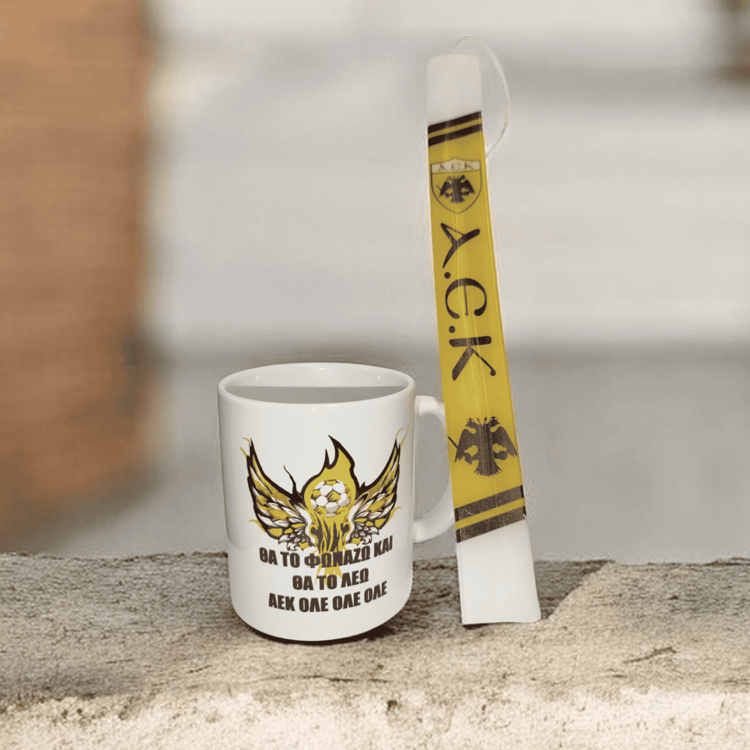 Σετ Λαμπάδα Πλακέ & Κούπα «ΘΑ ΤΟ ΦΩΝΑΖΩ ΚΑΙ ΘΑ ΤΟ ΛΕΩ ΑΕΚ ΟΛΕ ΟΛΕ ΟΛΕ» – 30 εκ. & 330ml