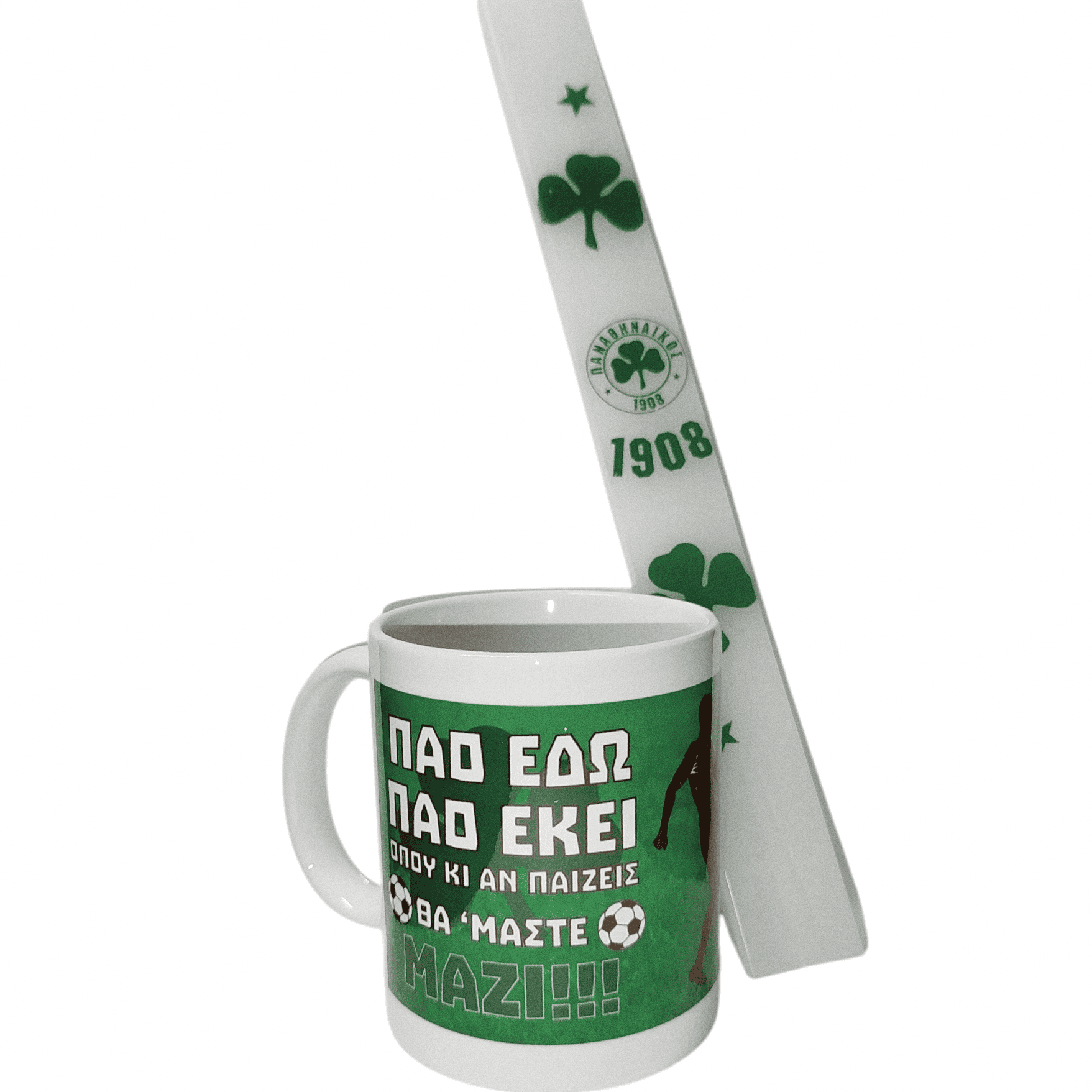 Ένα μοναδικό πασχαλινό σετ για τους μικρούς και μεγάλους φίλους του Παναθηναϊκού. Το σετ περιλαμβάνει πλακέ λαμπάδα 30εκ με θέμα τον αγαπημένο σύλλογο, καθώς και μια εντυπωσιακή κούπα με τη φράση «ΠΑΟ ΕΔΩ… ΜΑΖΙ», ιδανική για κάθε λάτρη της ομάδας.