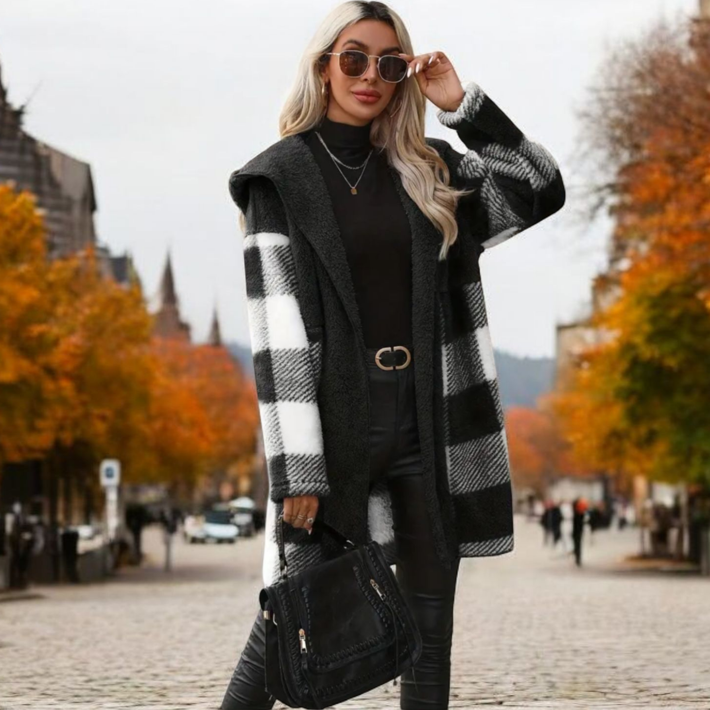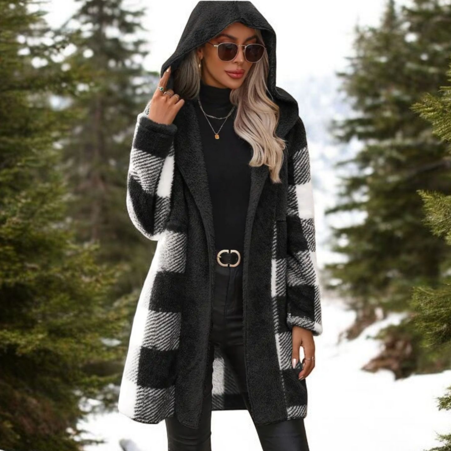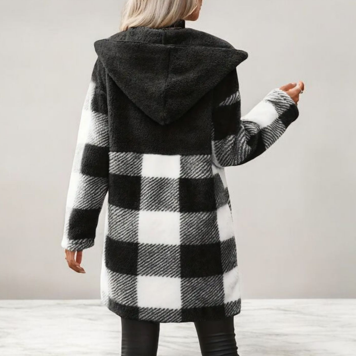 Ζακέτα Γούνινη Καρώ Μαύρη-Άσπρη με Κουκούλα